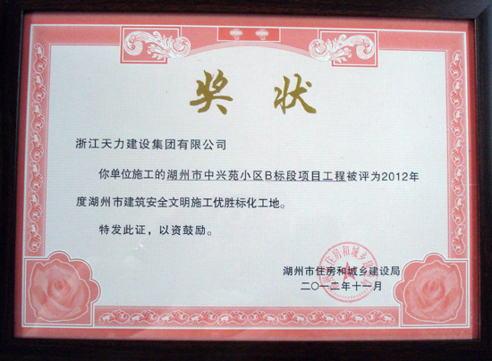湖州市中興苑小區B標段項目工程被評為2012年度市優勝標化