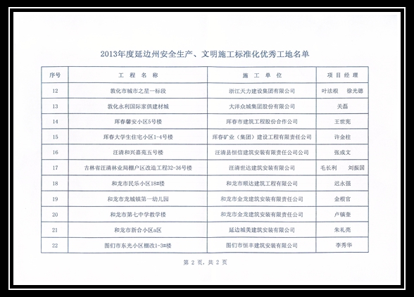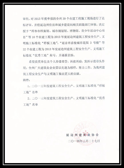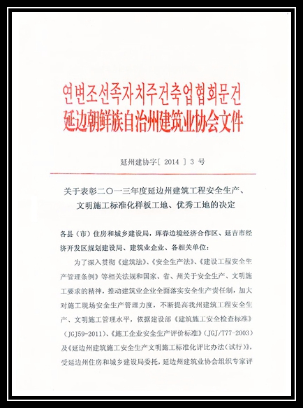 2013年度延邊州建筑工程安全生產、文明施工標準化樣板工地、優秀工地
