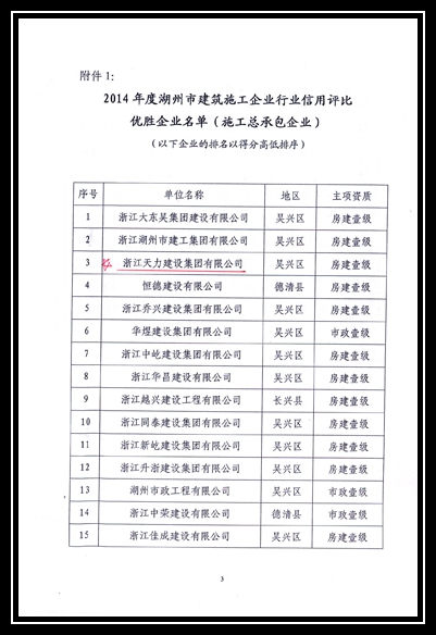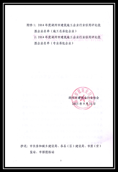 2014年度湖州市建筑施工企業(yè)行業(yè)信用評比優(yōu)勝企業(yè)