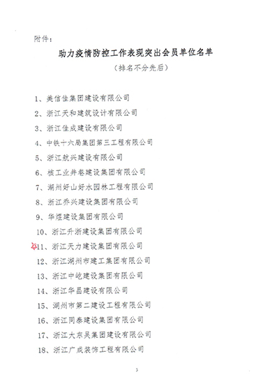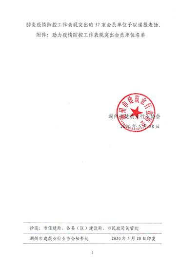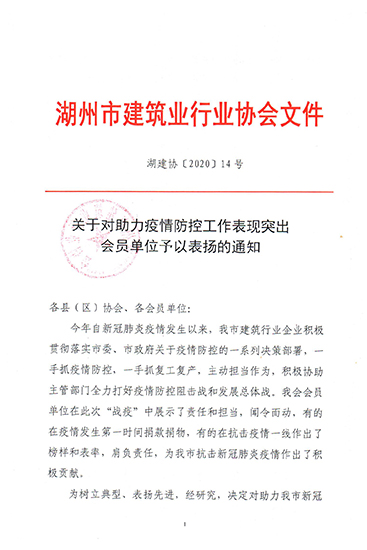 集團公司獲評湖州市建筑行業協會助力疫情防控工作表現突出會員單位