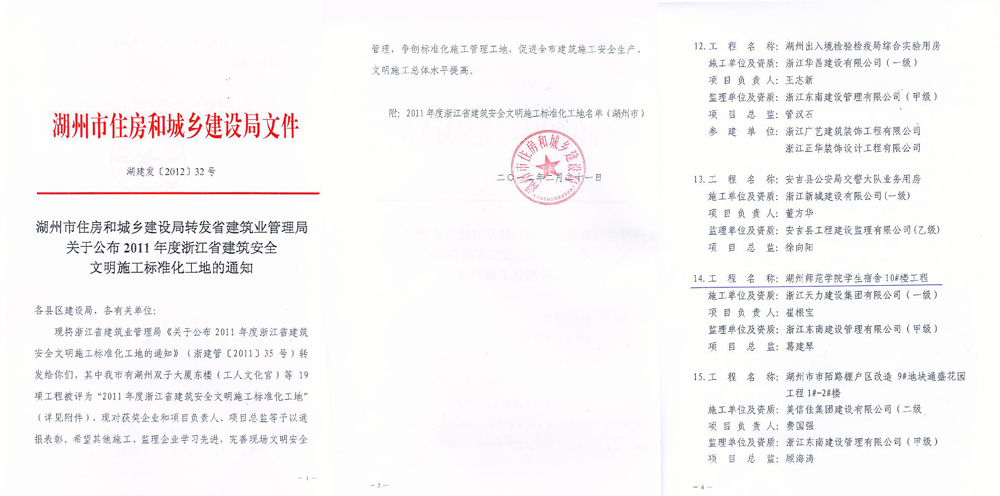 湖州師范學(xué)院學(xué)生宿舍10#樓被評(píng)為2011年度浙江省建筑安全文明施工標(biāo)準(zhǔn)化工地