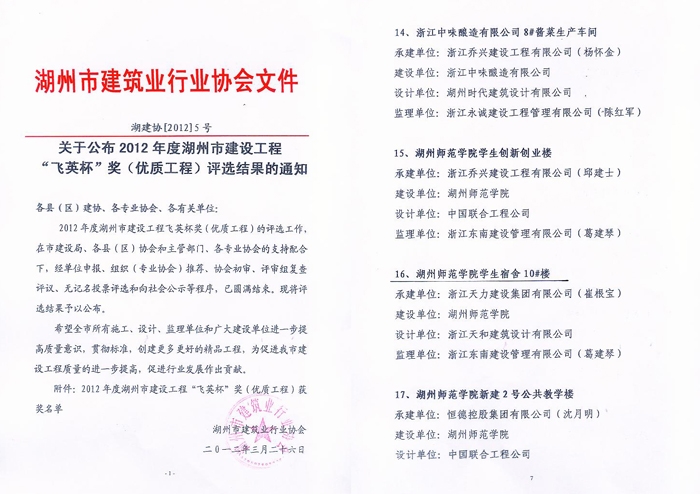 湖州師范學院學生宿舍10#樓工程榮獲2012年度湖州市“飛英杯”
