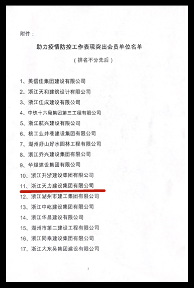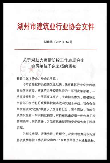 近日,湖州市建筑行業(yè)協(xié)會公布《關于對助力疫情防控工作表現(xiàn)突出會員單位予以表揚的通知》,對在疫情防控阻擊戰(zhàn)中表現(xiàn)突出的會員單位進行表彰,其中,浙江天力建設集團有限公司榮幸于表彰的先進單位中。